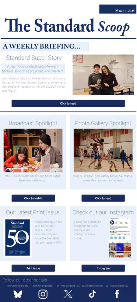 I designed the newsletter below — a new addition to The Standard this year — in collaboration with the Social Media Editor. We used The Standard’s official color palette for visual consistency and divided the layout into clear content blocks to enhance readability and eye flow. Each section maintains alignment and balance, with consistent font styles, button placement and image sizing, while contrast between text and background ensures clarity. This design helps guide the reader naturally from one element to the next, making the newsletter easy to navigate and visually cohesive. To learn more about the newsletter, visit the Marketing and Audience Engagement section.