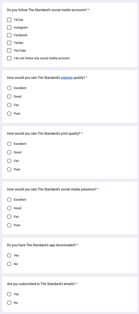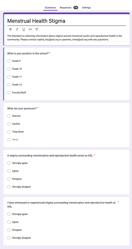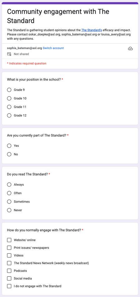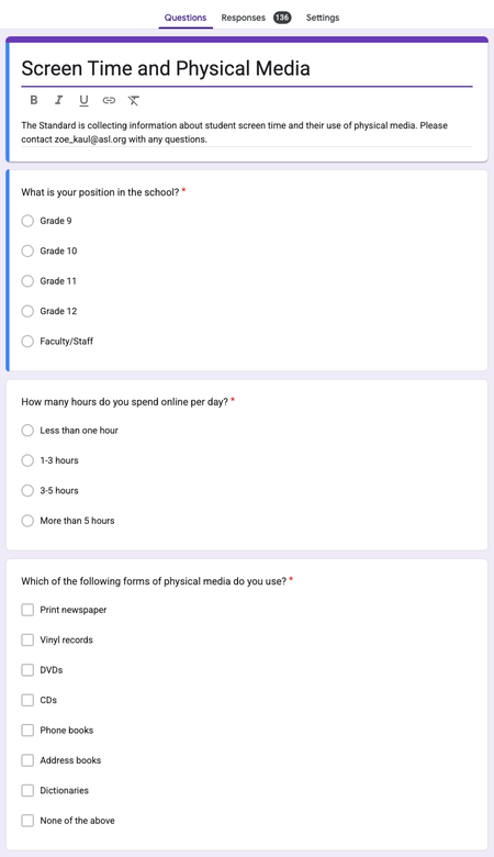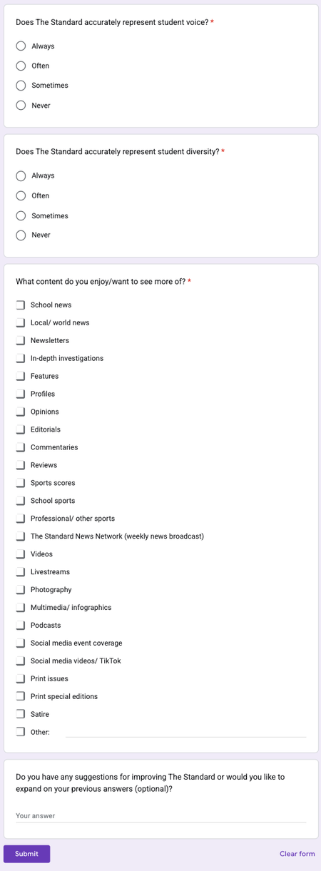 At the end of the 2023–24 school year, the EIC: Print and I sent a school-wide survey to gauge the high school community’s engagement with The Standard. While The Standard has previously received informal feedback from staff and a few readers outside the publication, this was our first time conducting a comprehensive survey as a publication. We analyzed the results over the summer and used the insights to shape our priorities — for instance, increasing marketing efforts for the website and social media to reach more students, which we implemented in the following school year.
