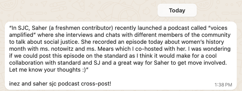 Recently, two members of the Social Justice Council, who also serve as reporters on The Standard, proposed a collaboration between the two student groups to publish a podcast they started for SJC through our platform. This partnership allows us to amplify important conversations, reach a wider audience and further establish The Standard as a hub for student-driven content across mediums. We hope to publish it in the upcoming weeks.
