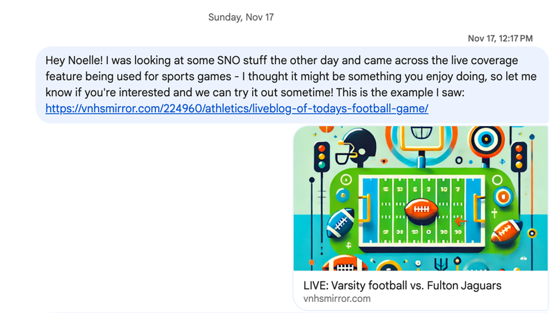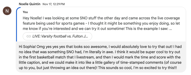 We are soon going to try adding the SNO live coverage feature while live streaming sports games, which will create more real-time audience engagement, allowing viewers to stay informed and connected as events unfold. View the email exchange below to see our plans for this.