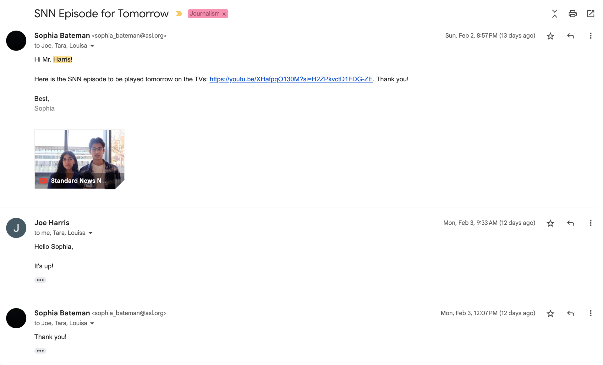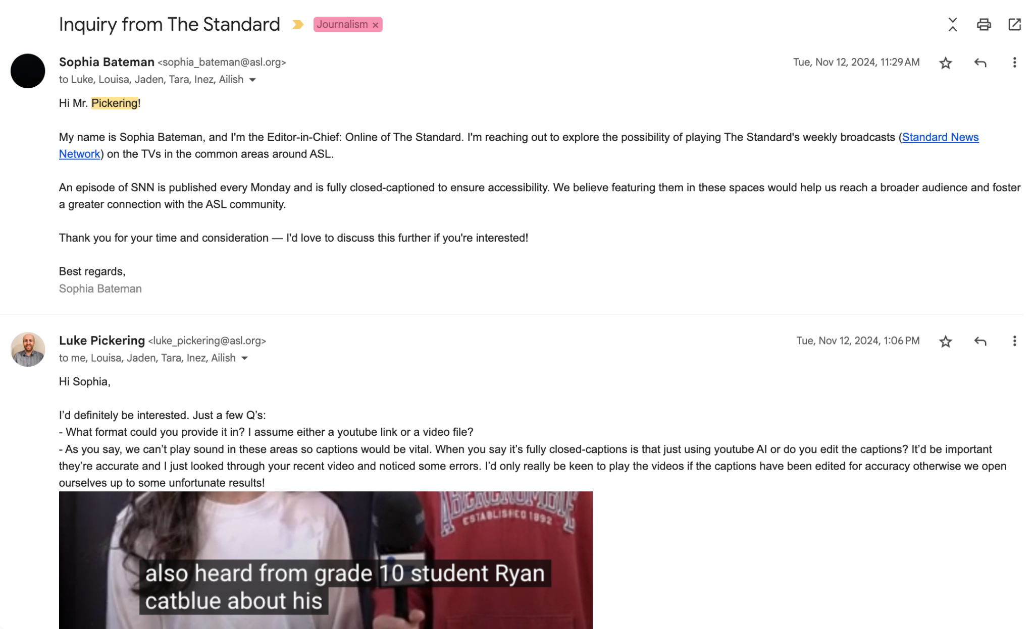 After attending the journalism convention in Philadelphia, where this idea first came about, I contacted Mr. Pickering, who manages the TVs in our school’s common areas, to request that our SNN episodes be played every Monday. Before this, we had only been promoting SNN episodes on our Instagram story and, while it was a good start, I knew we could do more. The email exchange below shows how the idea developed and was put into action.