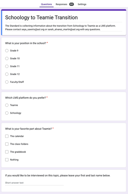 Below are examples of surveys I’ve edited and sent out this year. We frequently poll the high school community to gather student opinions, identify trends and ground our reporting in data that reflects the experiences and views of our audience. These statistics are often integrated into our articles to add depth and context, making our coverage more relevant, informed, and reflective of the community we serve.