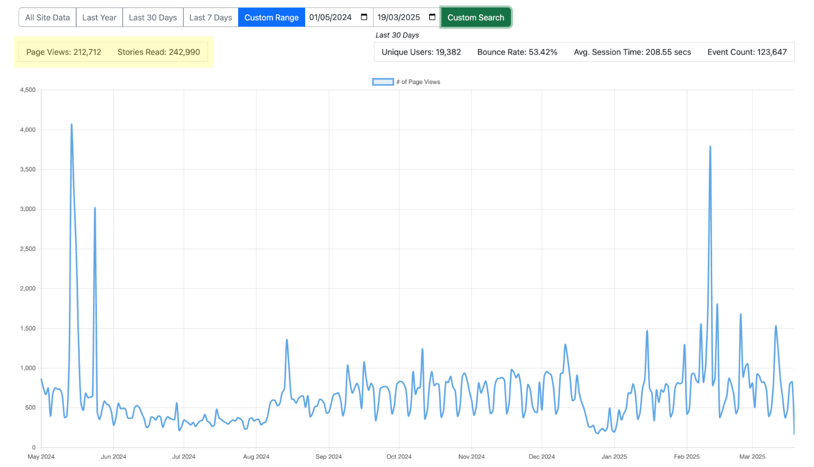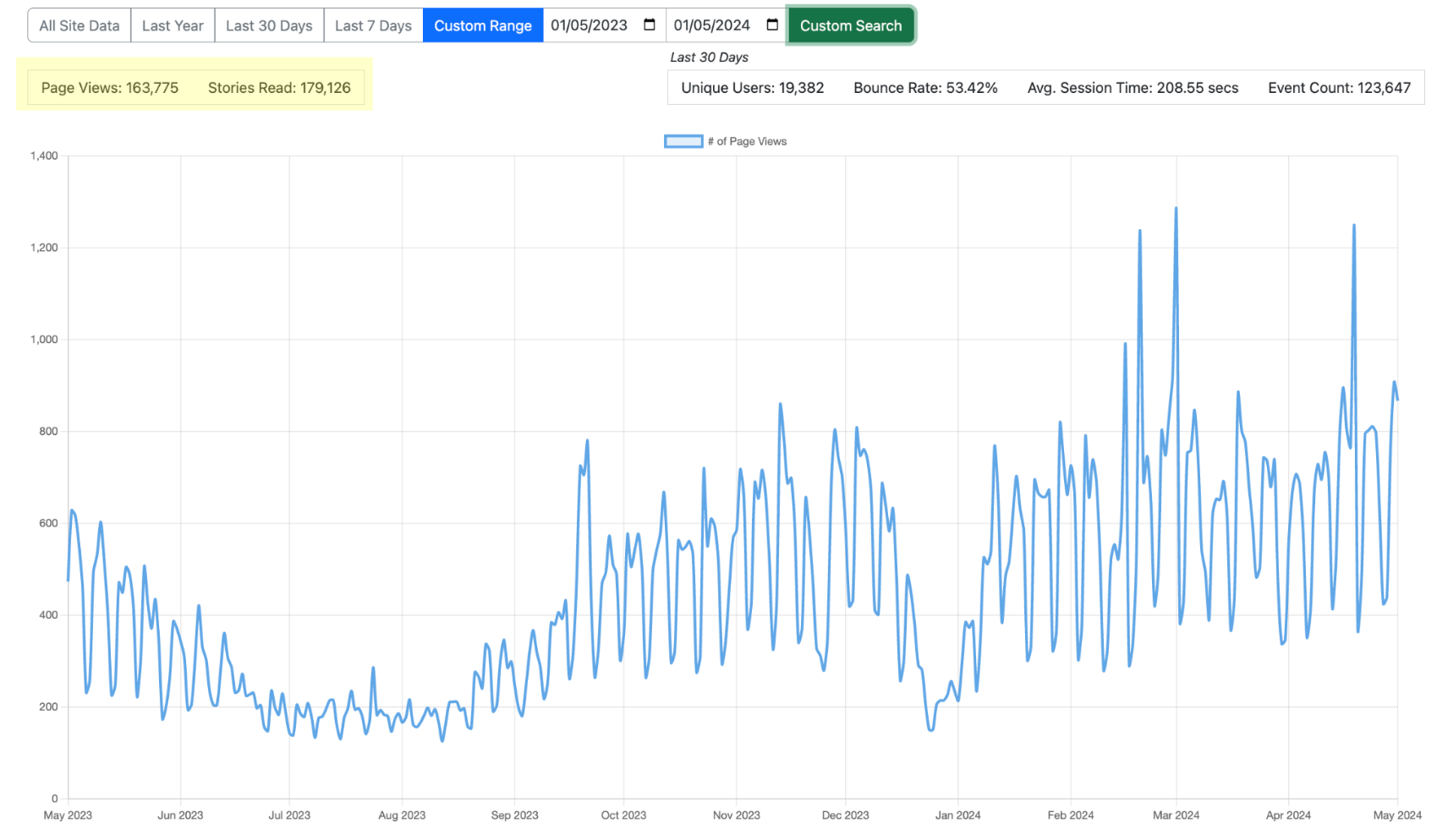 Comparing analytics from May 2023–May 2024 and May 2024–present — the respective terms of the 2023-24 and 2024-25 Editorial Boards — demonstrates clear growth. Despite covering fewer months, this year we’ve already seen over 50,000 more page views and over 60,000 more stories read, reflecting our increased focus on digital content and strategic audience engagement. Please note that, due to this increase, the graph scales are different.