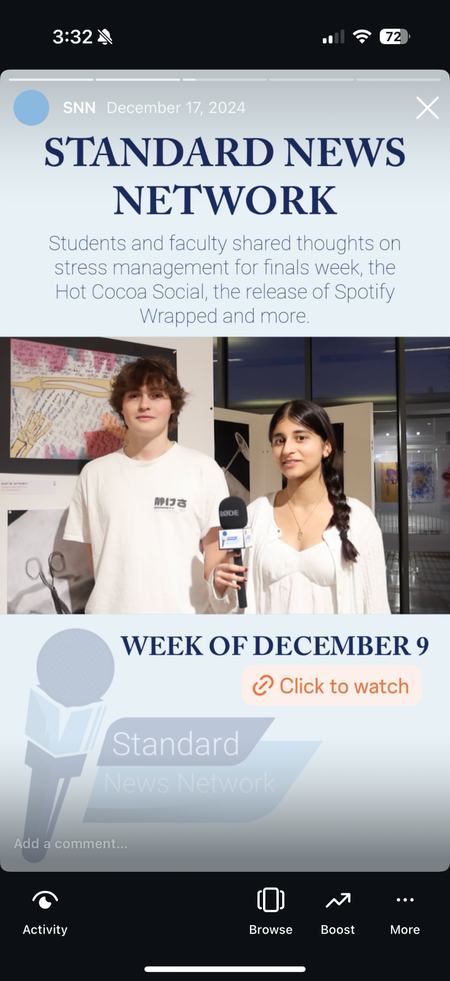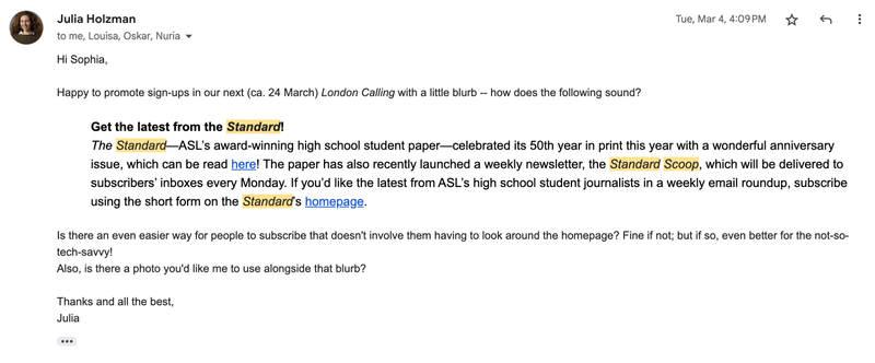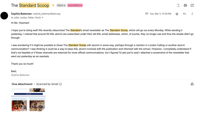 After sending out the first edition of our newsletter to our original mailing list that hadn't been used in years, I noticed many emails bounced back due to expired school accounts. To address this, I reached out to the alumni coordinator and asked if she could promote The Standard Scoop in the next alumni newsletter — and she agreed. I hope this outreach will lead to more alumni sign-ups from those looking to stay connected with their former high school and our publication.