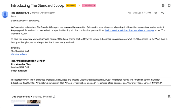 On the day we launched the new Standard Scoop, I sent an email to the entire High School community and posted an Instagram story to encourage sign-ups. By the end of the day, we gained over 50 new subscribers, bringing our mailing list to around 200. In a school of approximately 500 students, I consider that strong engagement and a promising start for expanding our reach.