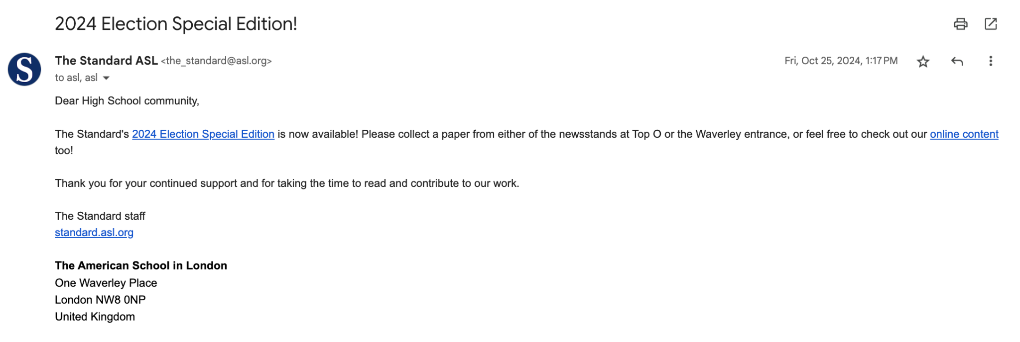 Because our Summer 2024 Rewind package was released just before the school year began, I chose to feature it in our introductory email to the high school community. Beyond that, I’ve also sent targeted emails to promote special editions and coverage packages throughout the year. These outreach efforts help drive readership and ensure that our content reaches a wide audience. Below is an example of an email I wrote to advertise our 2024 Election Special Edition.