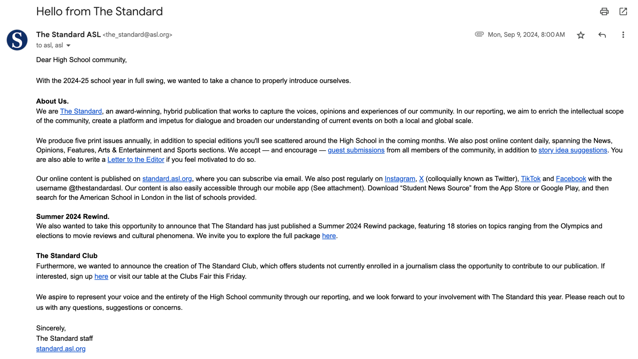 At the start of the school year, I drafted and sent this email to the entire high school community to reintroduce The Standard, highlight our mission and promote our recently released Summer 2024 Rewind package. The goal was to engage readers early, boost traffic to our site and remind the community that our publication is a space for diverse voices and relevant, student-driven storytelling. This outreach also helped set the tone for increased audience engagement throughout the year.