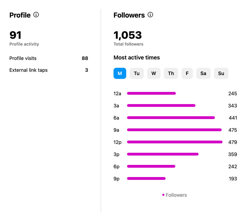 I regularly monitor our social media accounts and analytics to track engagement, assess what types of content perform best and identify areas for improvement. This helps ensure our strategies remain effective and allows us to adjust in real time to maximize reach and audience interaction. Hover over the image below to read detailed descriptions of how I utilize our Instagram account's analytics.